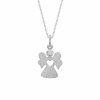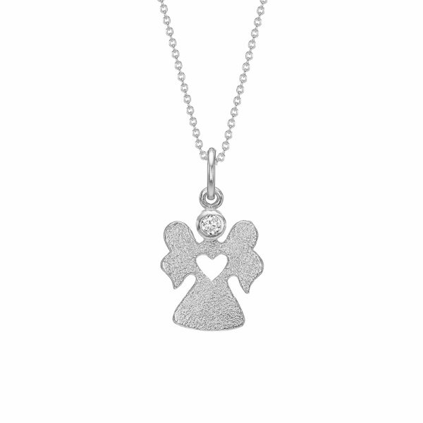 Engel med hjertet på rette sted i sølv med zirkonia på fin ankerkæde. Englen har en mat overflade.