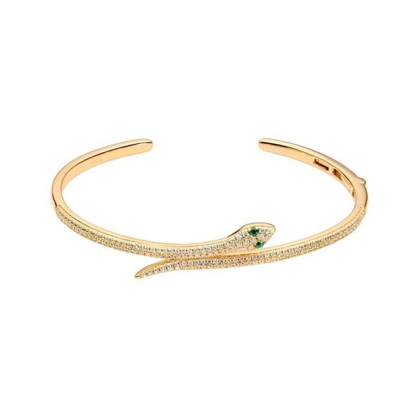 Slangearmbånd i forgyldt sølv med 162 håndfattede zirkonia i hvide og grønne. Armbåndet er ovalt med en åbning i den ene side således at det sidder perfekt på håndleddet.