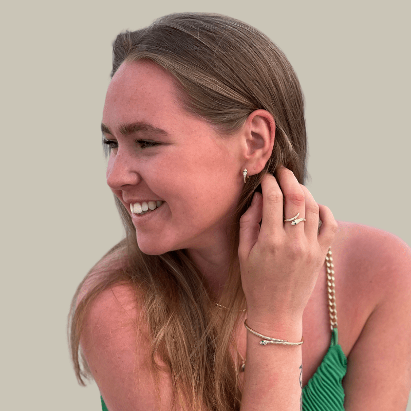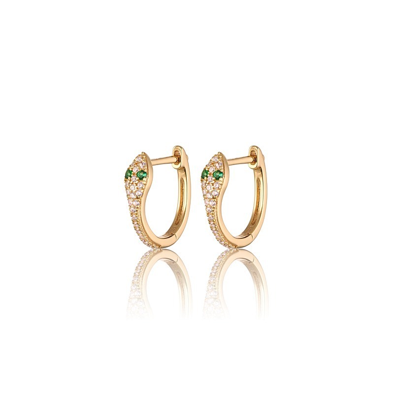 Slangeøreringe i forgyldt sølv med hver 23 håndfattede zirkonia i hvide og grønne.
