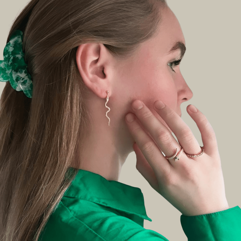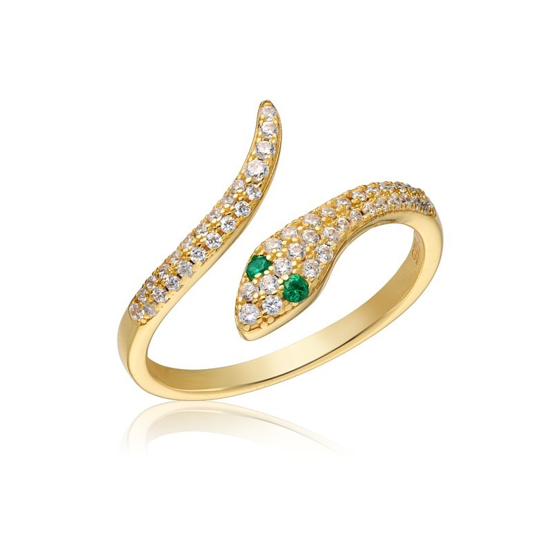 Slangering i forgyldt sølv med 44 håndfattede zirkonia i hvide og grønne.