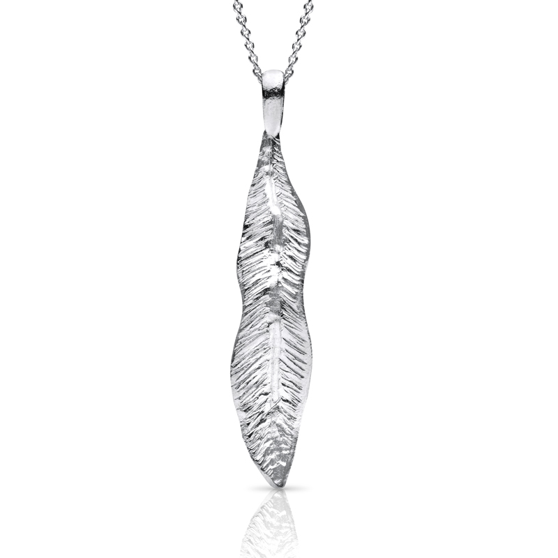 Smukt vedhæng i sølv, der former et fjer og skaber et råt, men feminint udtryk.