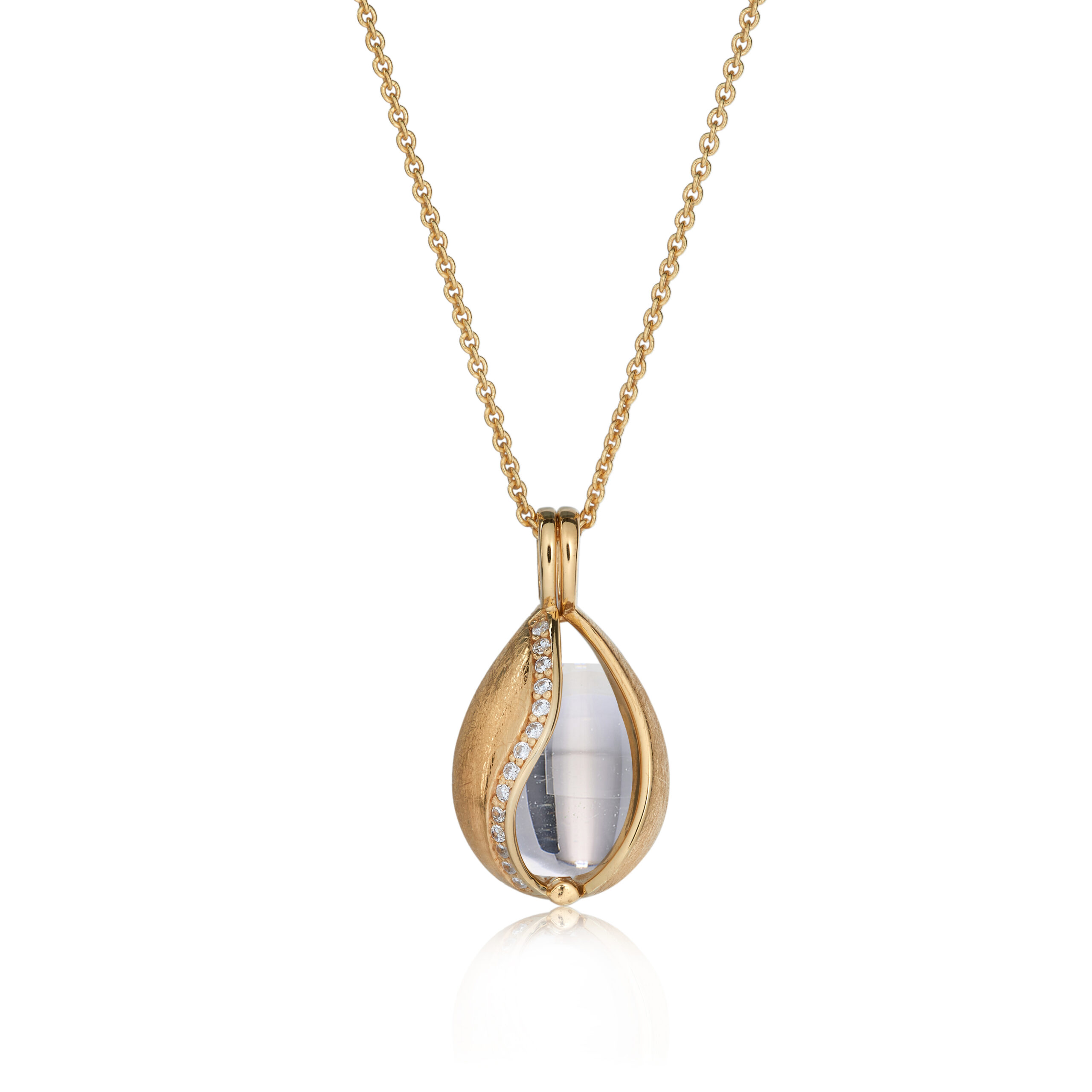 Halskæde i guldbelagt sølv pyntet med zirkonia og bjergkrystal. Du kan selv skifte sten i smykket.