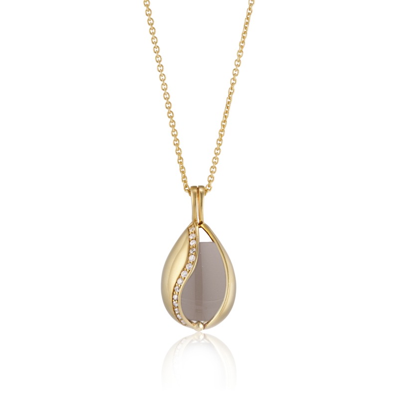 Halskæde i guldbelagt sølv pyntet med 14 zirkonia og grå agat. Du kan selv skifte sten i smykket.