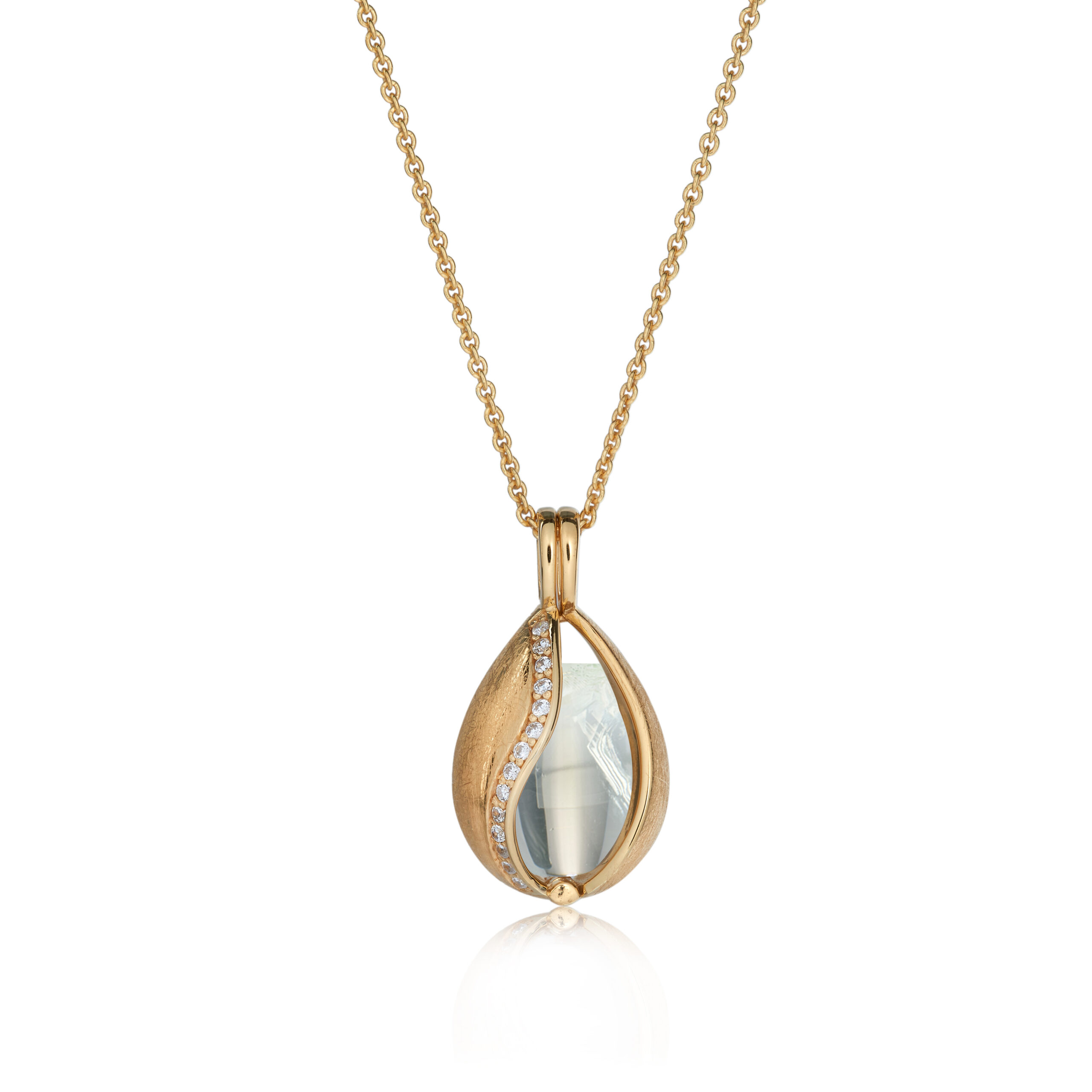 Halskæde i guldbelagt sølv pyntet med zirkonia og grøn krystal. Du kan selv skifte sten i smykket.
