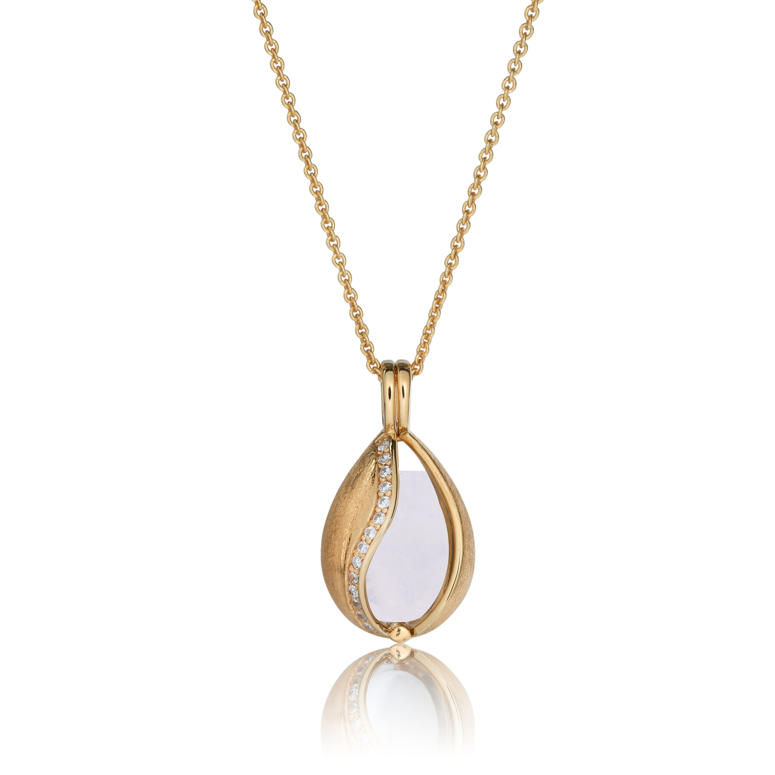 Halssmykket er i guldbelagt sølv pyntet med 14 zirkonia og bjergkrystal. Du kan selv skifte sten i smykket.