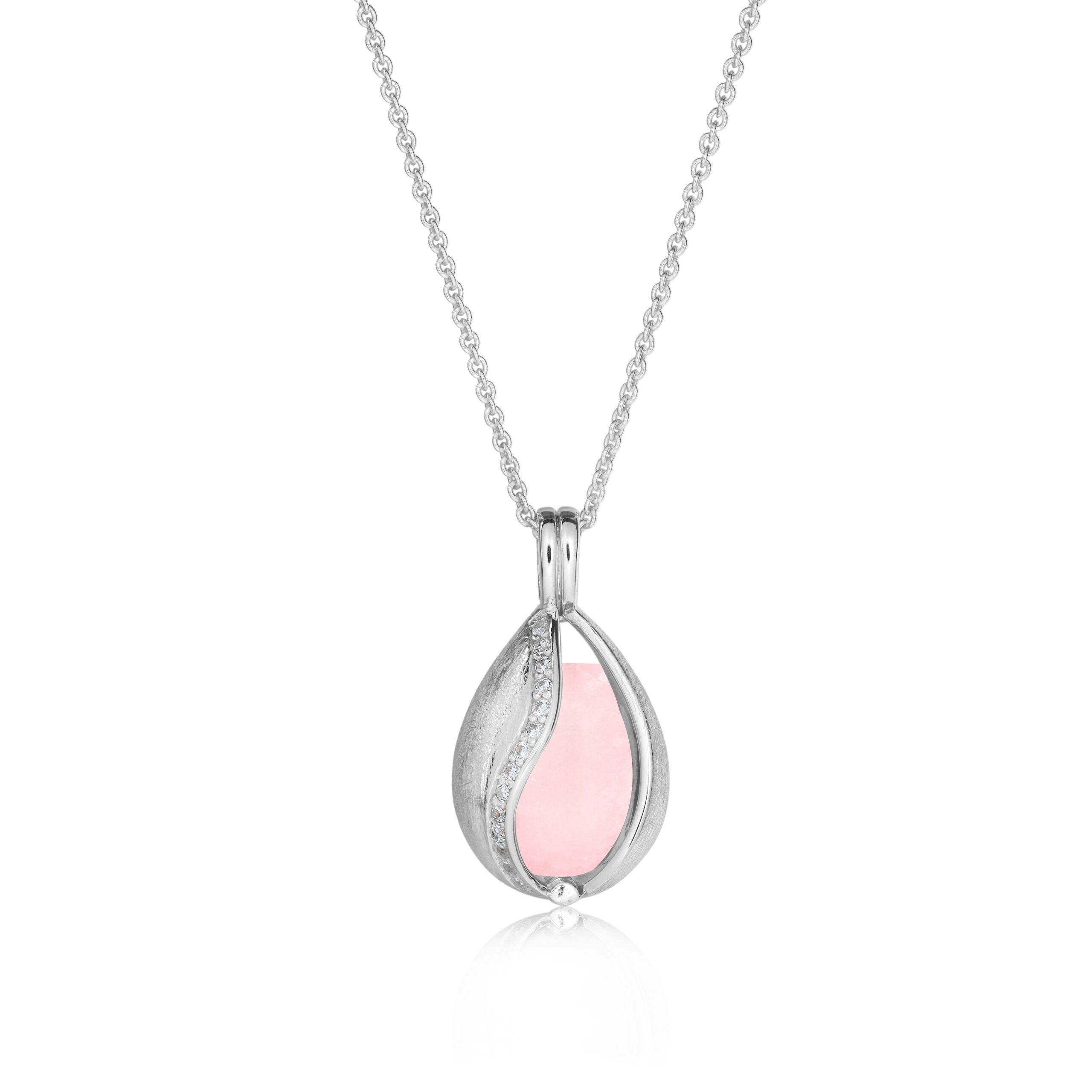 Halskæde i sølv pyntet med zirkonia og feminin rosakvarts. Du kan selv skifte sten i halskæden.