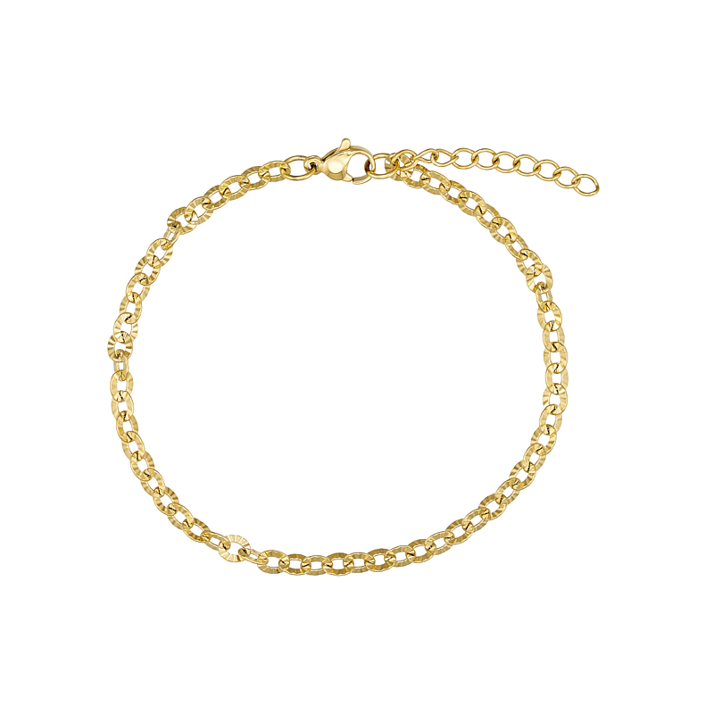 Feminin ankelkæde i stål, belagt med 14 karat guld. Ankelkæden er 25cm + 4 cm forlænger.
