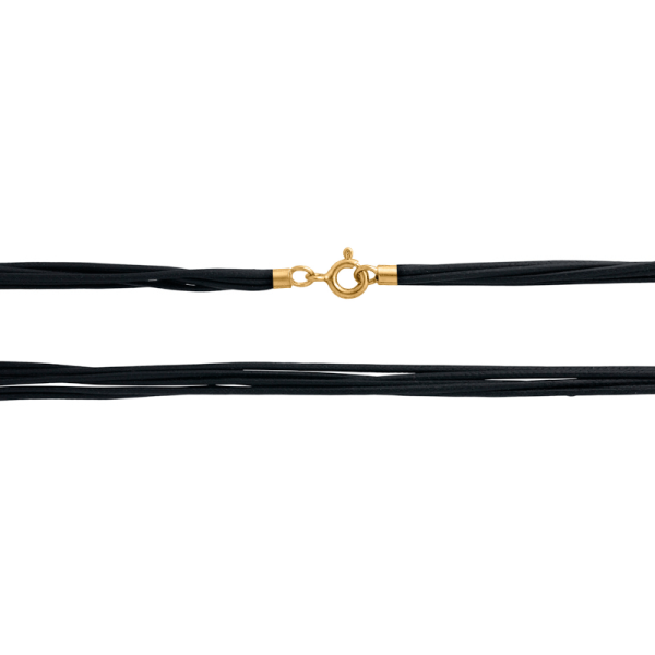 Kæden er i vokset bomuld med karabinlås i sølv forgyldt med 18 karat guld.