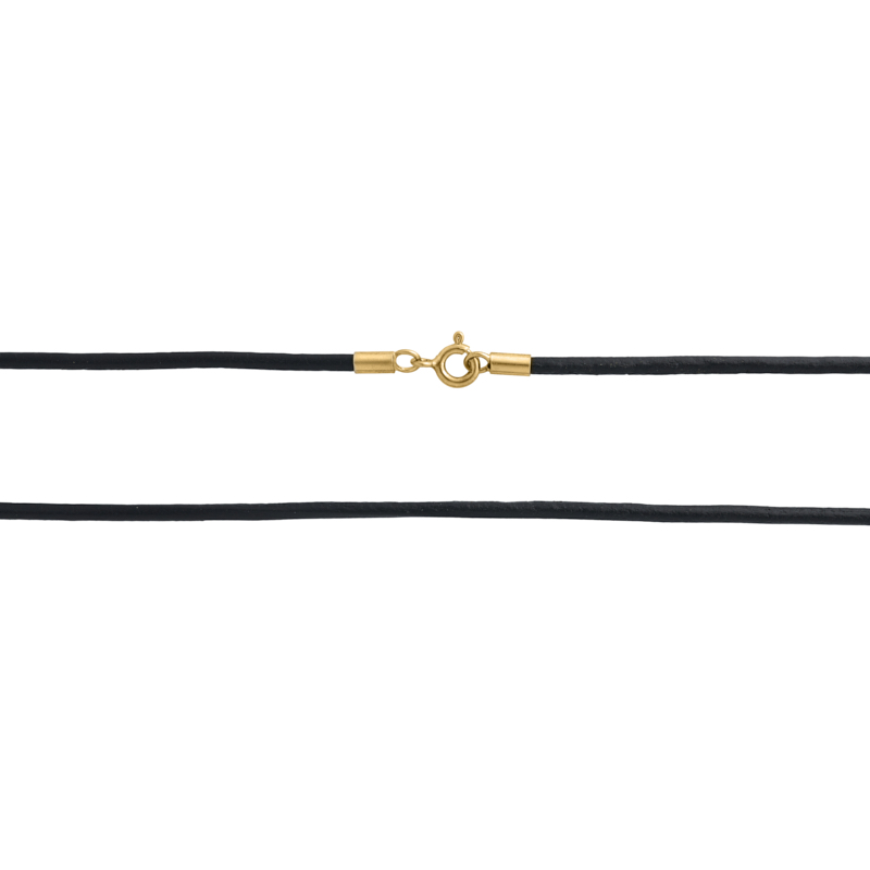 Kæden er i vokset bomuld med karabinlås i sølv forgyldt med 18 karat guld.