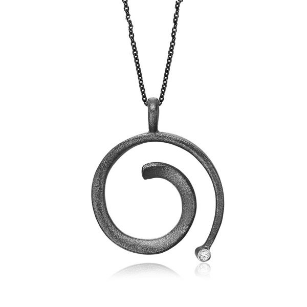Et bevægende kunstværk. Vedhæng i oxideret (sort) sølv formet som en spiral med en smuk zirkonia. Et smykke der emmer af livsglæde og spiritualitet.