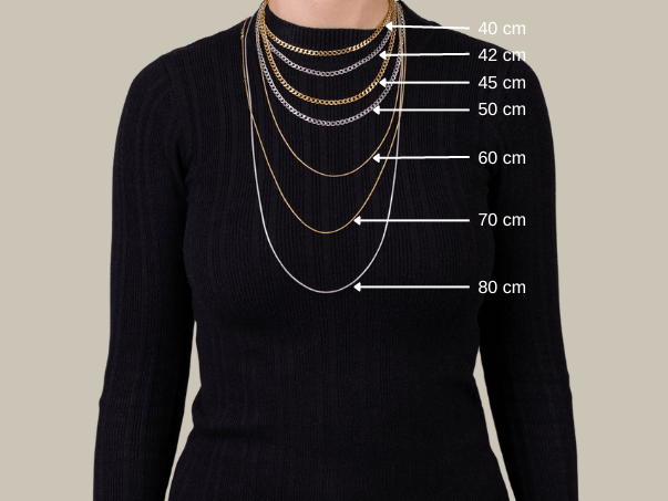 Standardkæden er vores fleksible kæde som er både 42, 45 og 50 cm. Den kædelængde kan enhver pige og kvinde bruge.